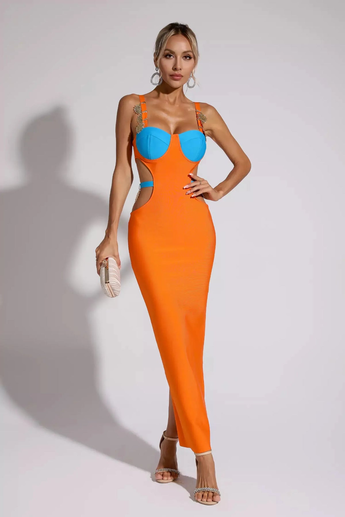 Get ready for bubbles and a night of fun in the Destiny Orange Bandage Metallic Maxi Dress! Styled with elastic bandages, this dress features metal straps and a deep U neckline. Back cutouts wrap around the sides of the slinky midi skirt for added flirty appeal. Style it with a tote and heels, and you're ready to go the party!