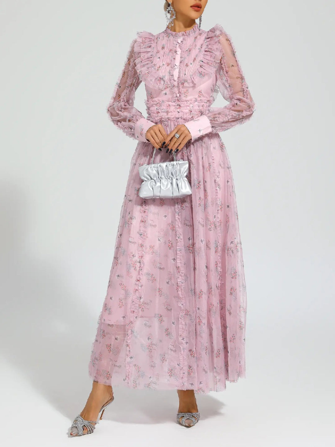Elegant Ruffle Lace Solid Color Maxi Dress