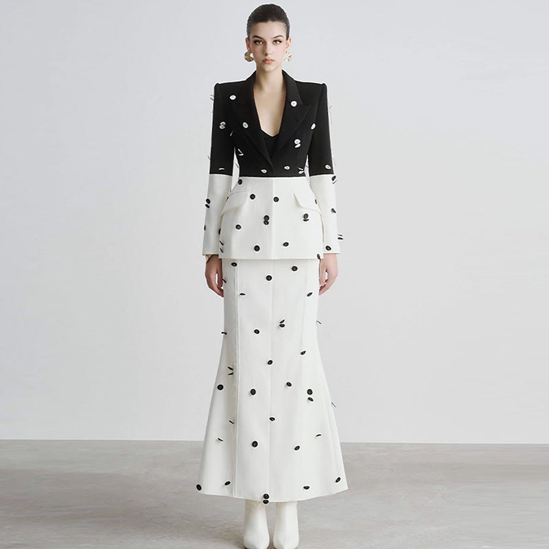 Anna Sequined Beading Colorblock Blazer and Fishtail Long Skirt Suit