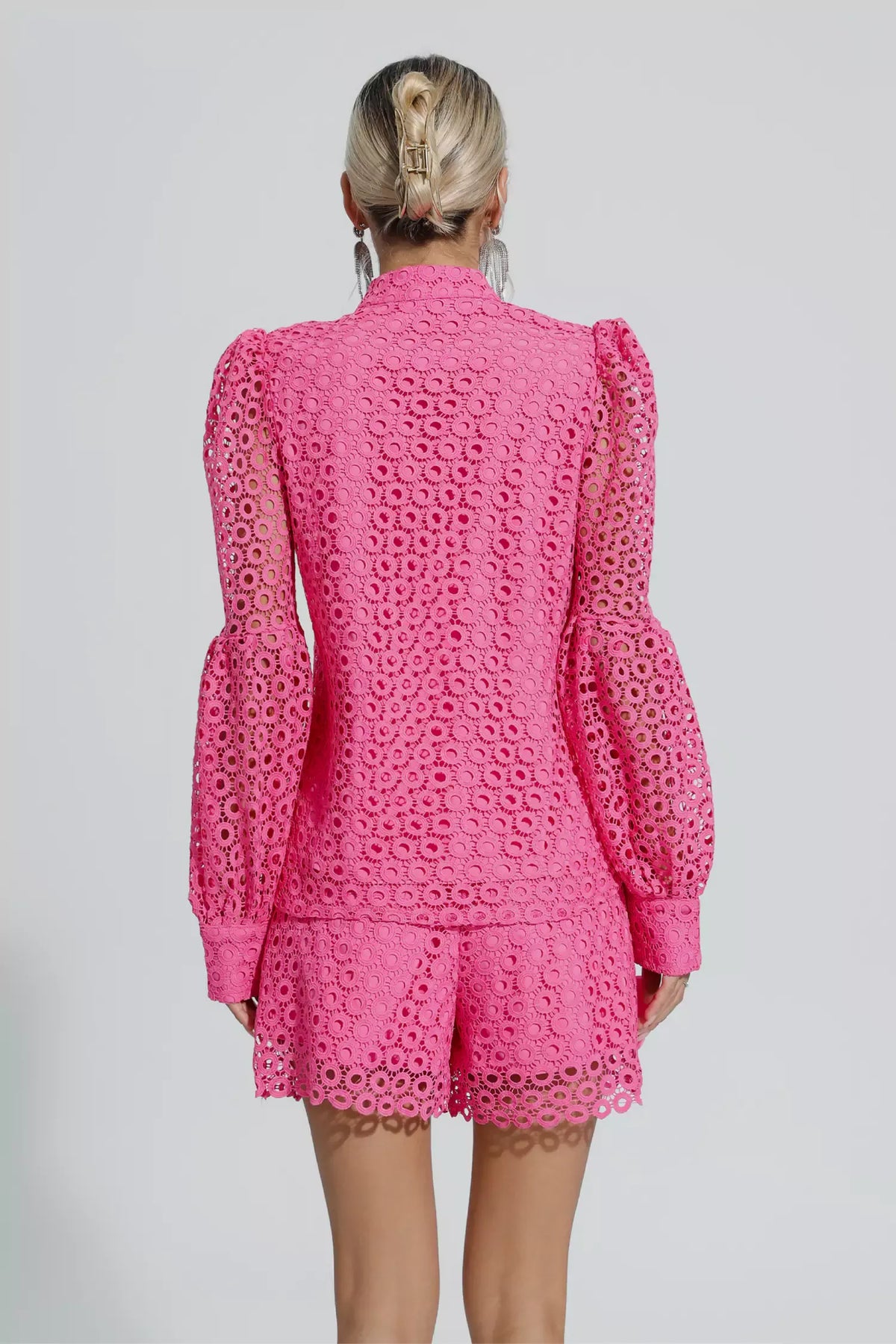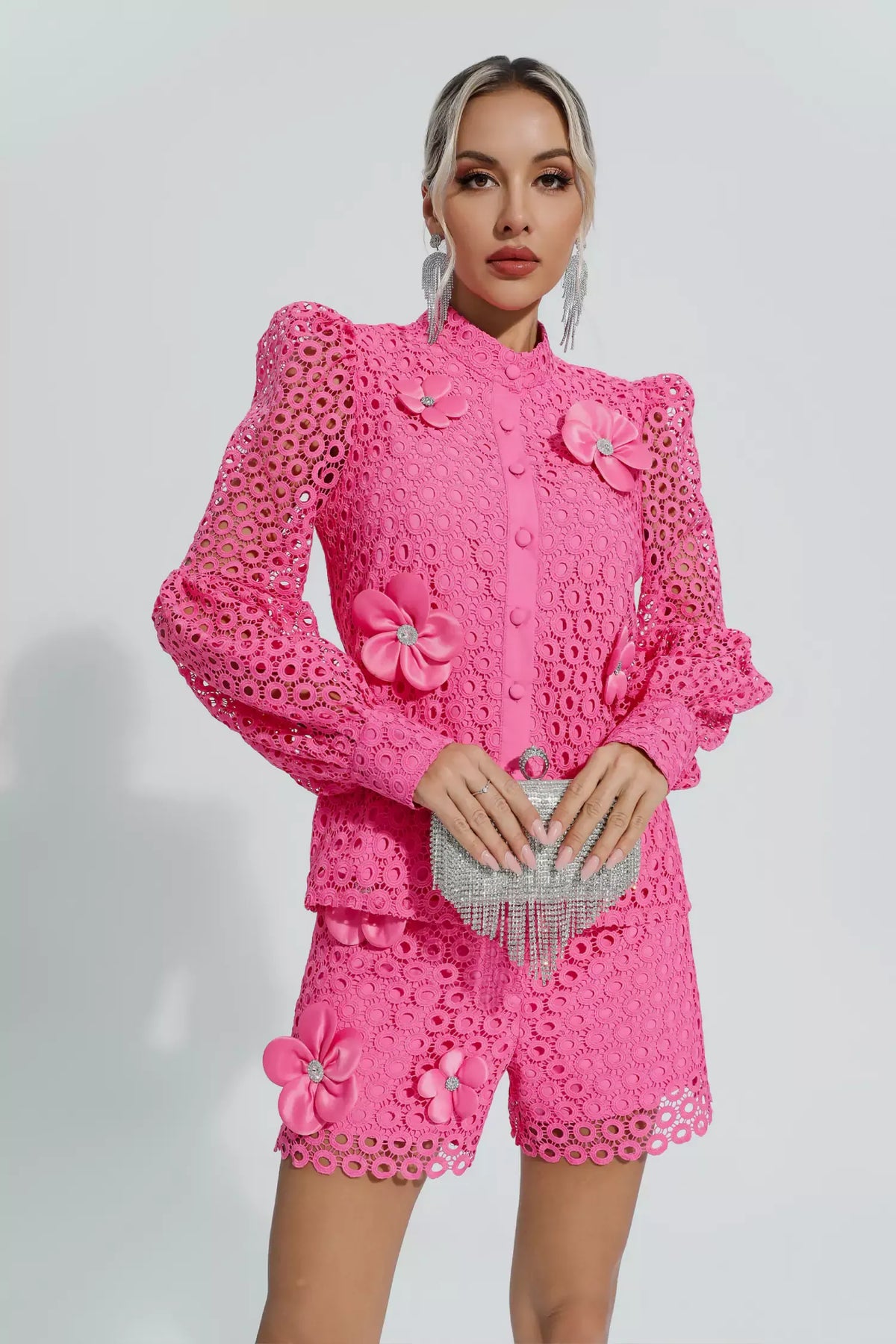 The Macy Rose Red Hollow Floral Set is an elegant ensemble perfect for any occasion. It features a stand collar and lantern sleeves, exuding sophistication and style. The single-breasted shirt and mid-rise shorts create a polished look. Designed with a beautiful hollow and floral, this two-piece set is a must-have for the fashion-forward individual.