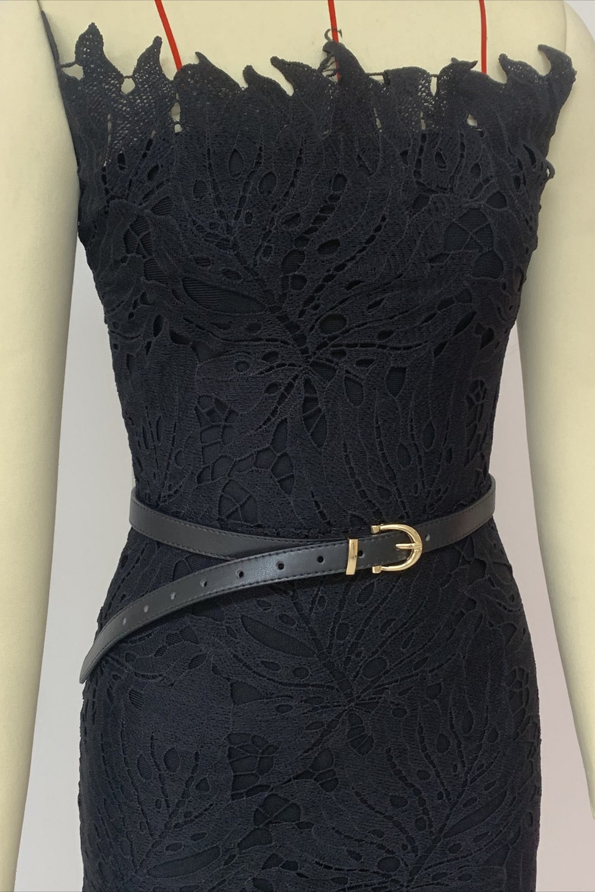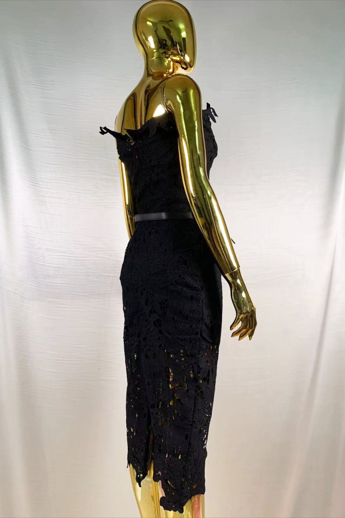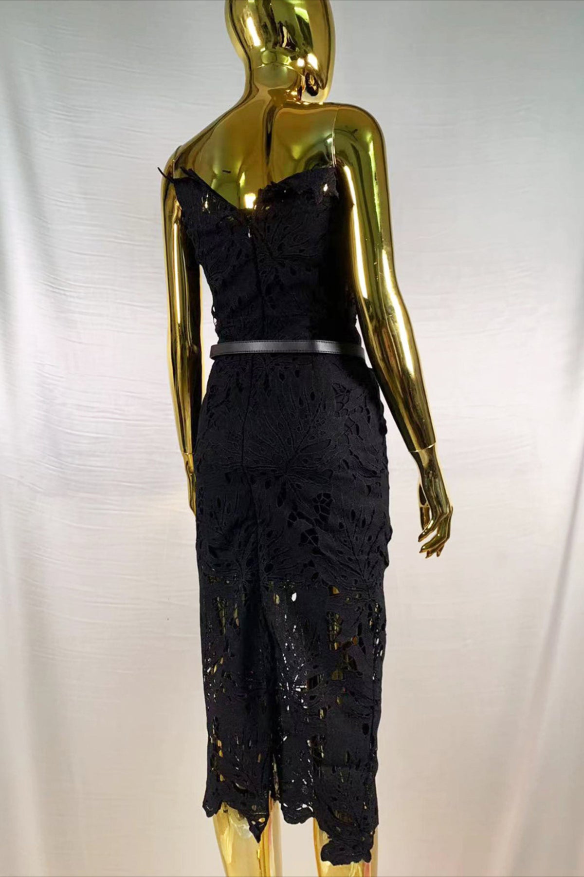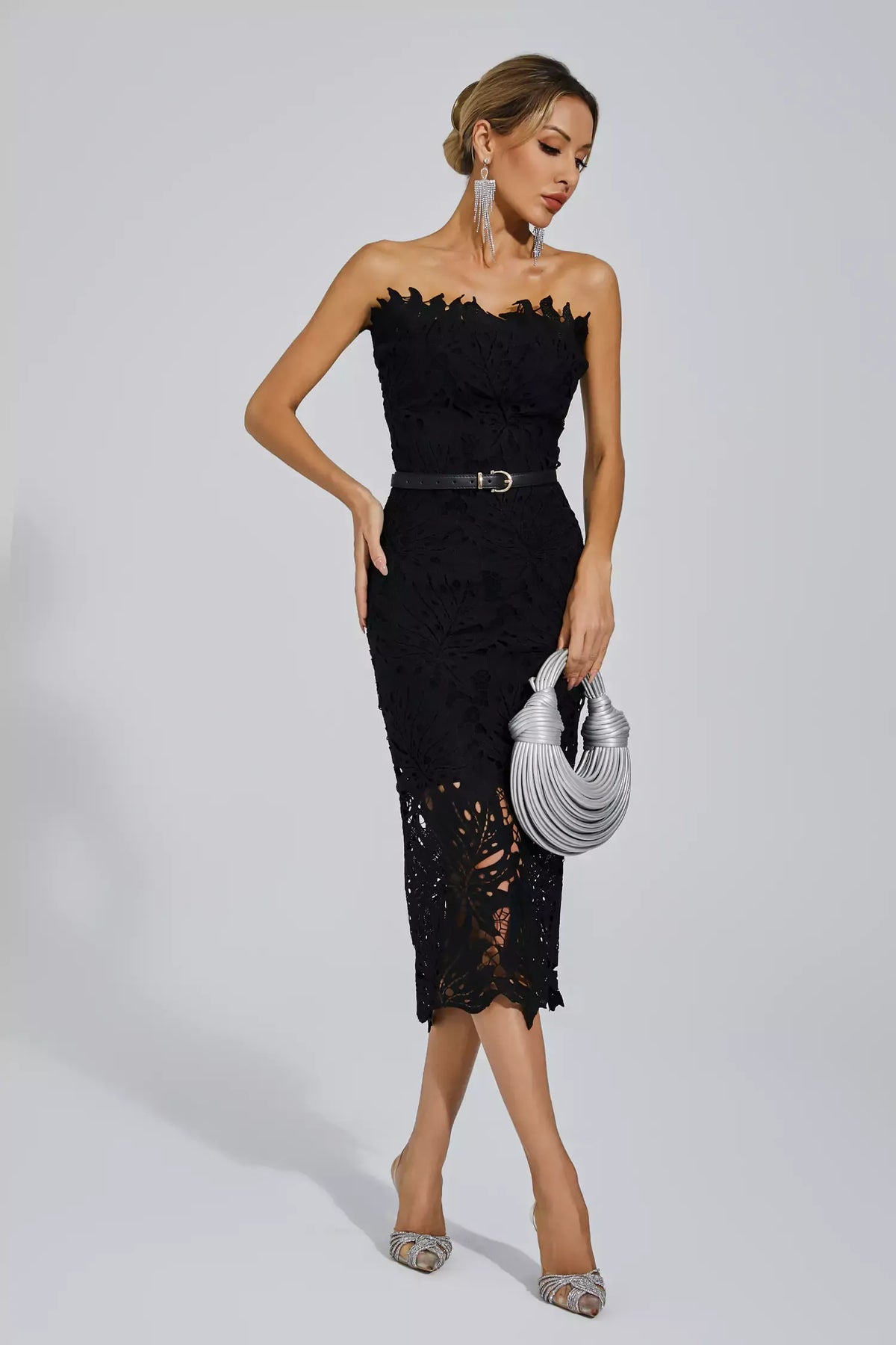 The Jazlyn Black Floral Lace Midi Dress is the perfect finishing touch to any outfit. Its lace fabric and midi length create a classic and timeless look, while the strapless design makes it ideal for any special occasion. Enjoy a sophisticated, feminine finish all night long. Simply complete the look with heels.