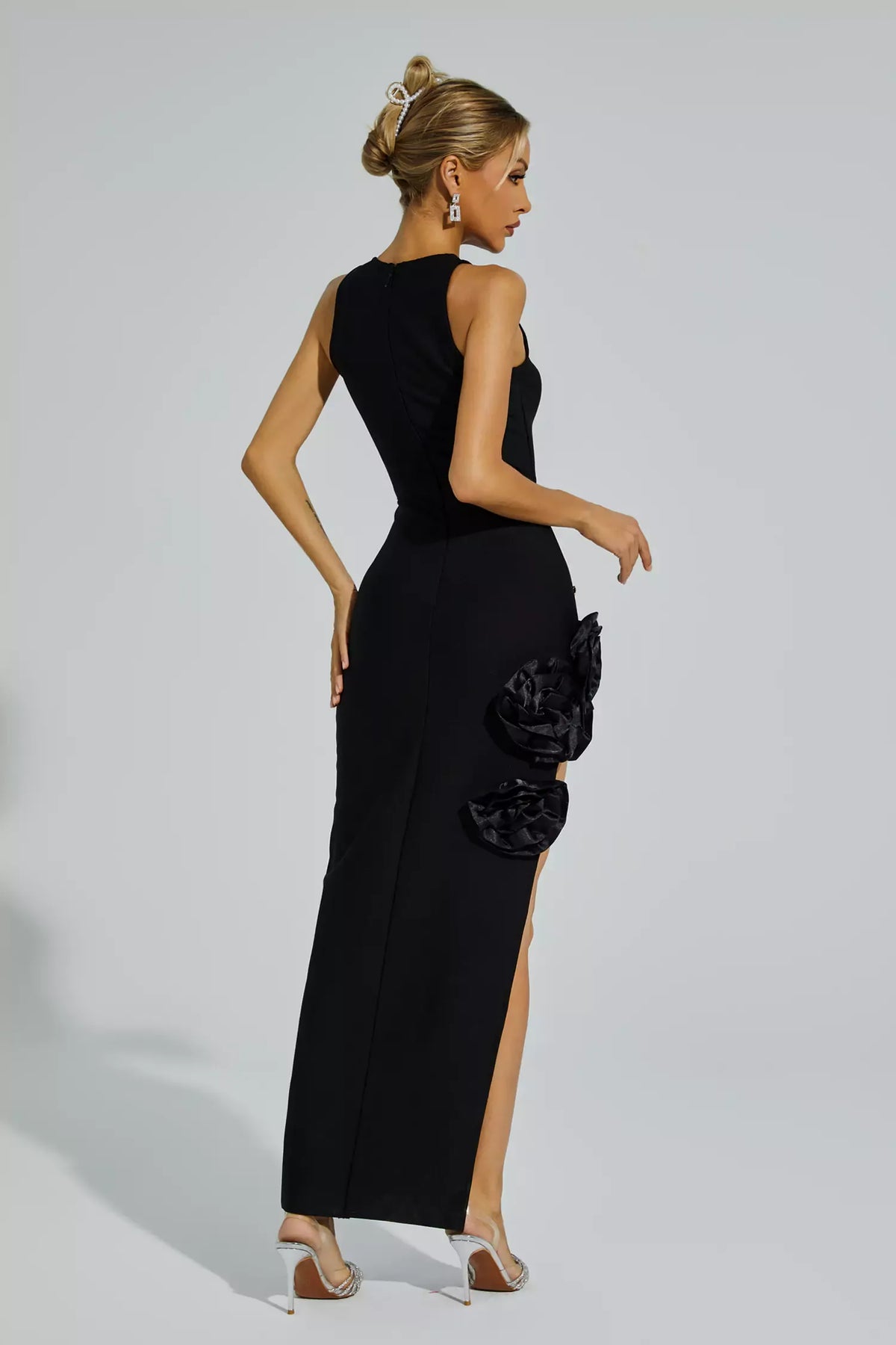 Crafted from high-quality bandage fabric, the Darcy Black Rose Slit Bandage Dress exudes timeless elegance. Its pleated edges and a flattering slit revealing a hint of skin, while the golden embellishments add a touch of luxury. Perfect for any formal occasion, this long dress hugs the curves effortlessly, making it a must-have addition to any fashionable wardrobe.