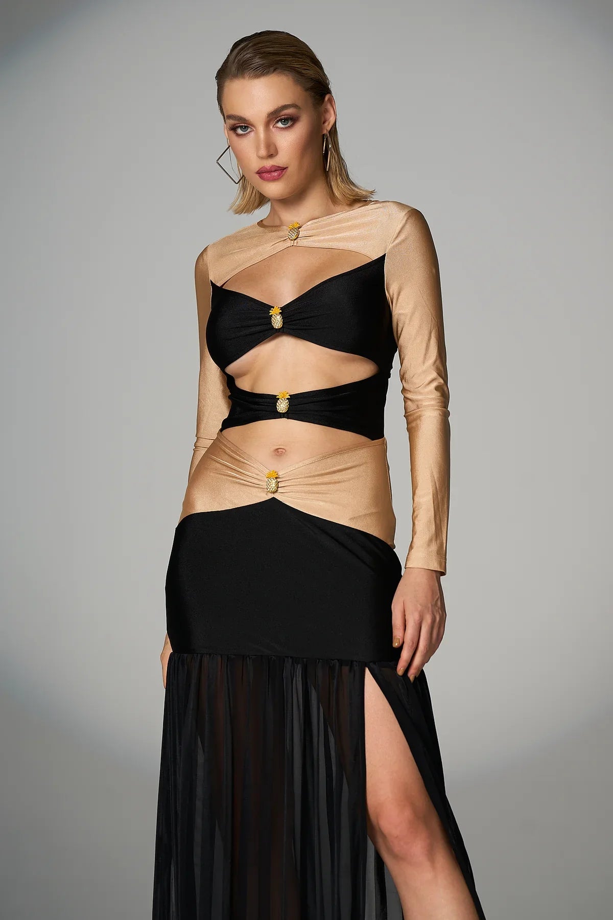 Look sophisticated and stylish in the Hedwig Patchwork Cutout Satin Dress. Featuring a unique cutout design, this dress is crafted from luxurious satin for a high-end finish. The patchwork detailing adds a chic touch, making it perfect for any special event.