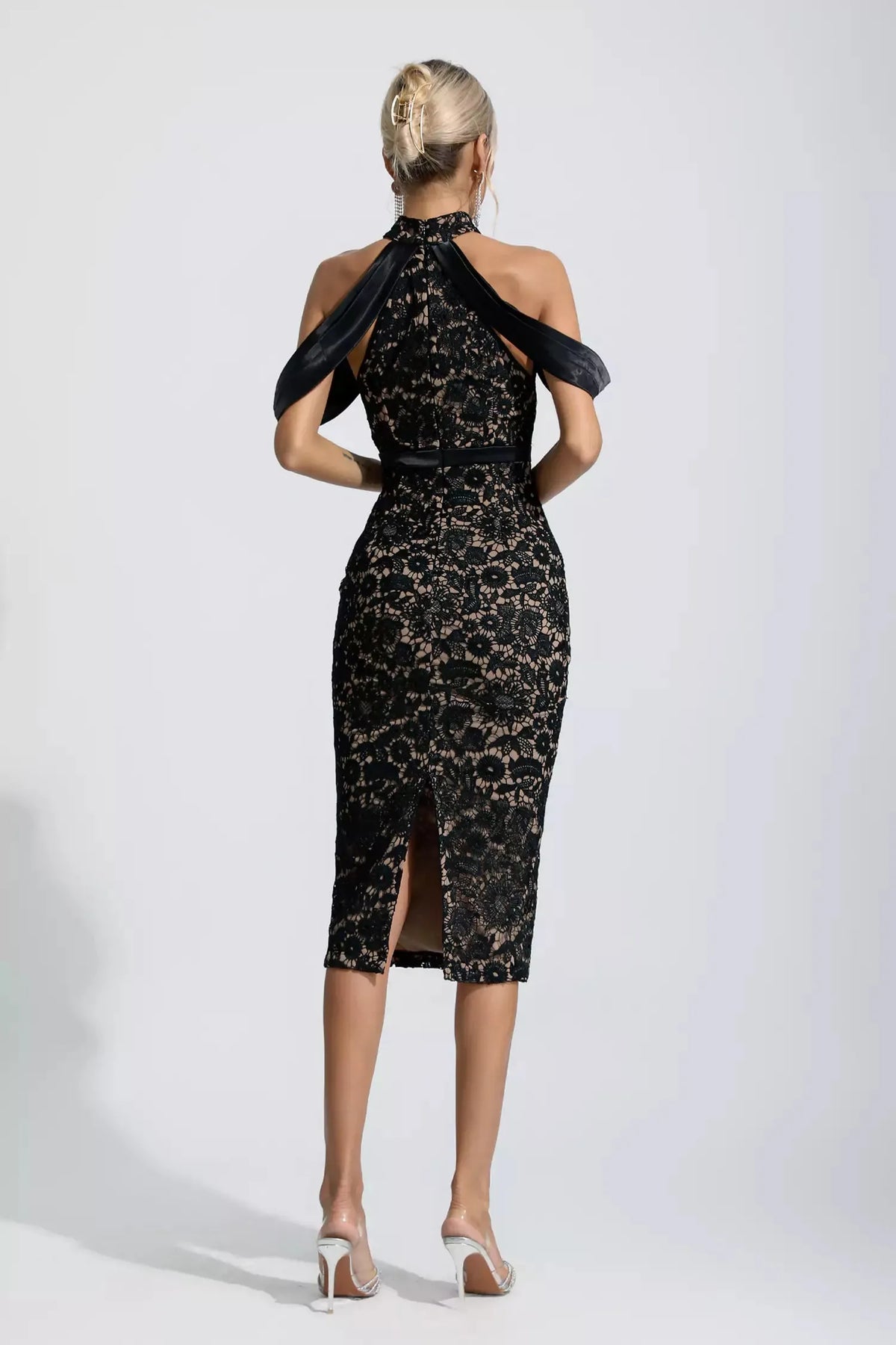 Showcasing sexy and elegant attire is our Madelynn Black Floral Halter Midi Dress. Comfortable fabric cinches for a slim fit. Halter neck design adds uniqueness. Draped side straps tie at the bust and drape over the arms for a chic look. Perfect for cocktails, weddings, or parties. Complete the look with heels and sparkly earrings.