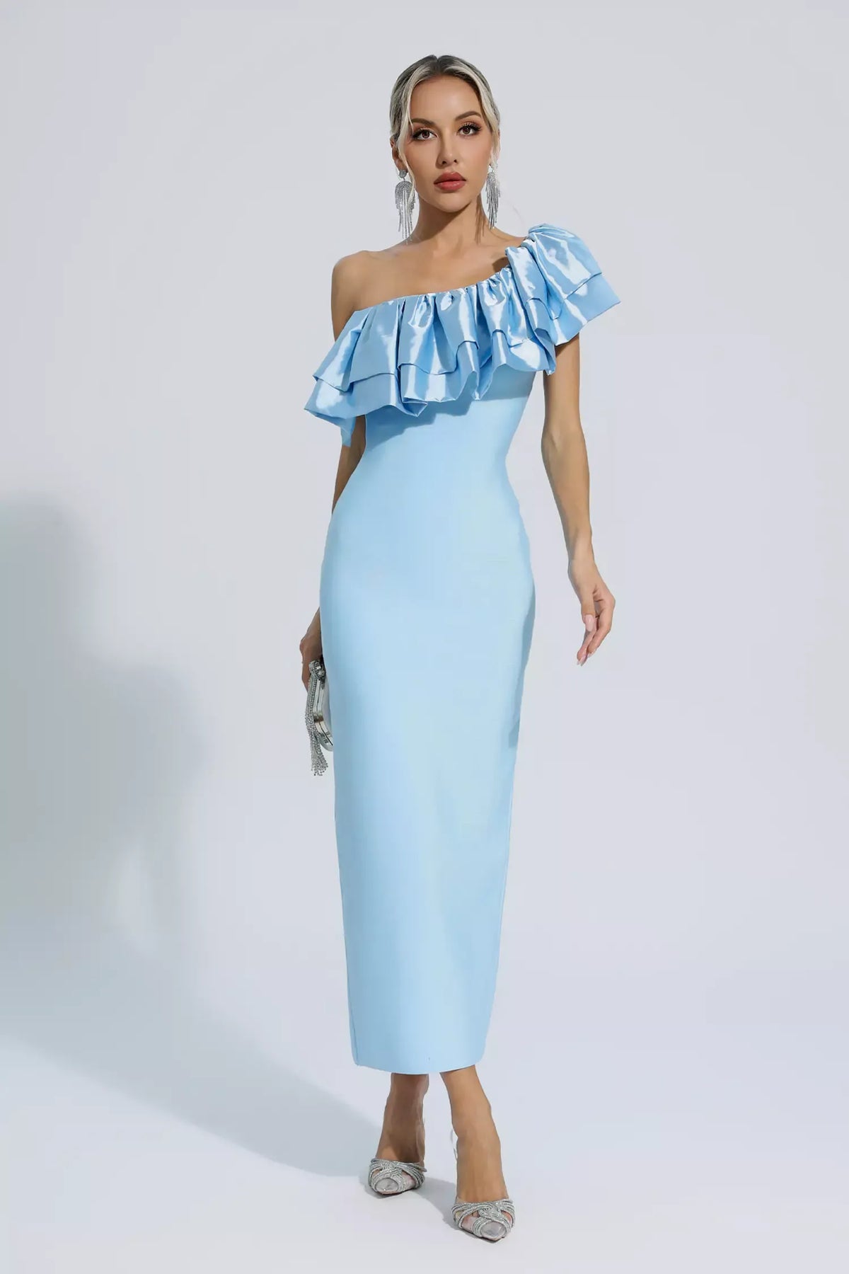 The Emerie Blue One Shoulder Ruffles Bandage Dress exudes a classic elegance. This French-inspired dress features a single shoulder design and delicate ruffles, creating a captivating and sensual look. Perfect for autumn gatherings and stylish parties, this dress is sure to enhance your evening wardrobe with its graceful charm.