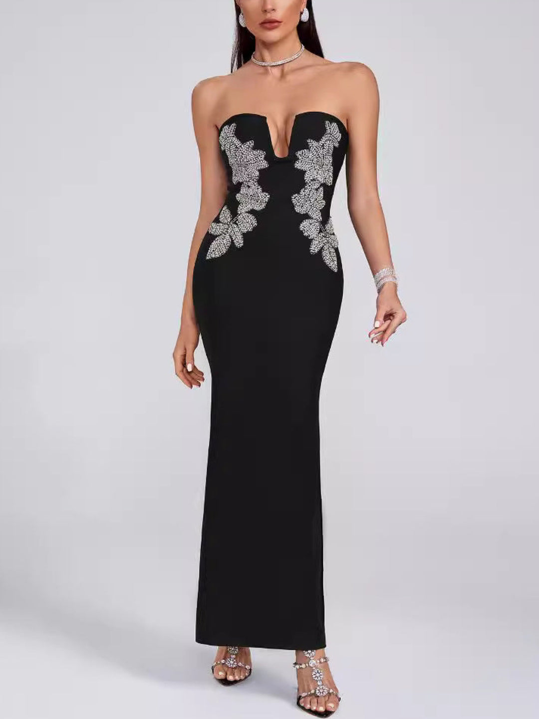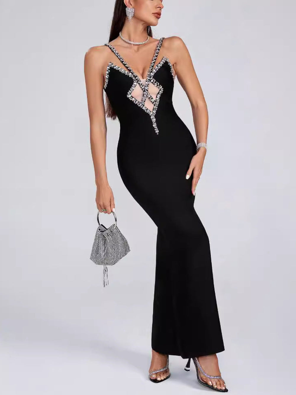 Elegant Diamond Deep V Maxi Dress