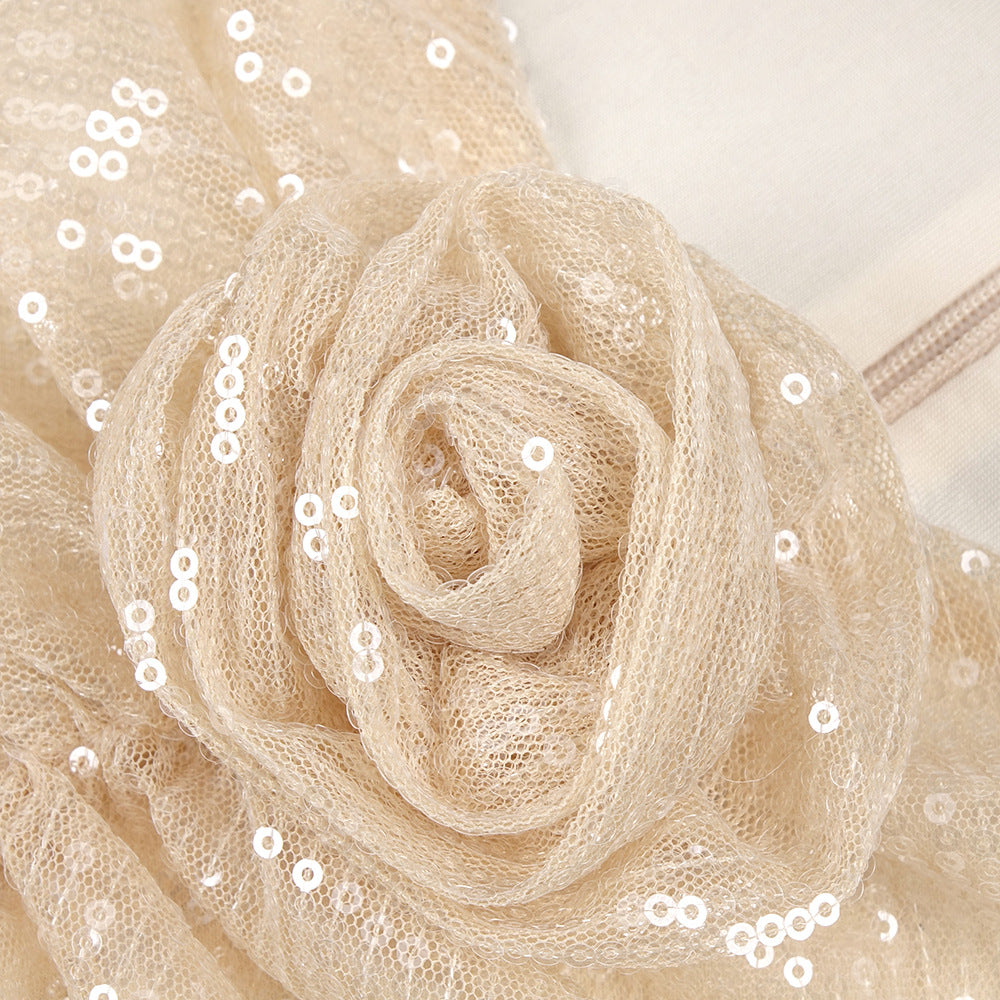 From romantic rosettes to liquid-like sequins, this dress structured by padded shoulders and a diamond cut-out, the design's embellished, ankle-length silhouette makes a daring statement, softened by floral appliques.