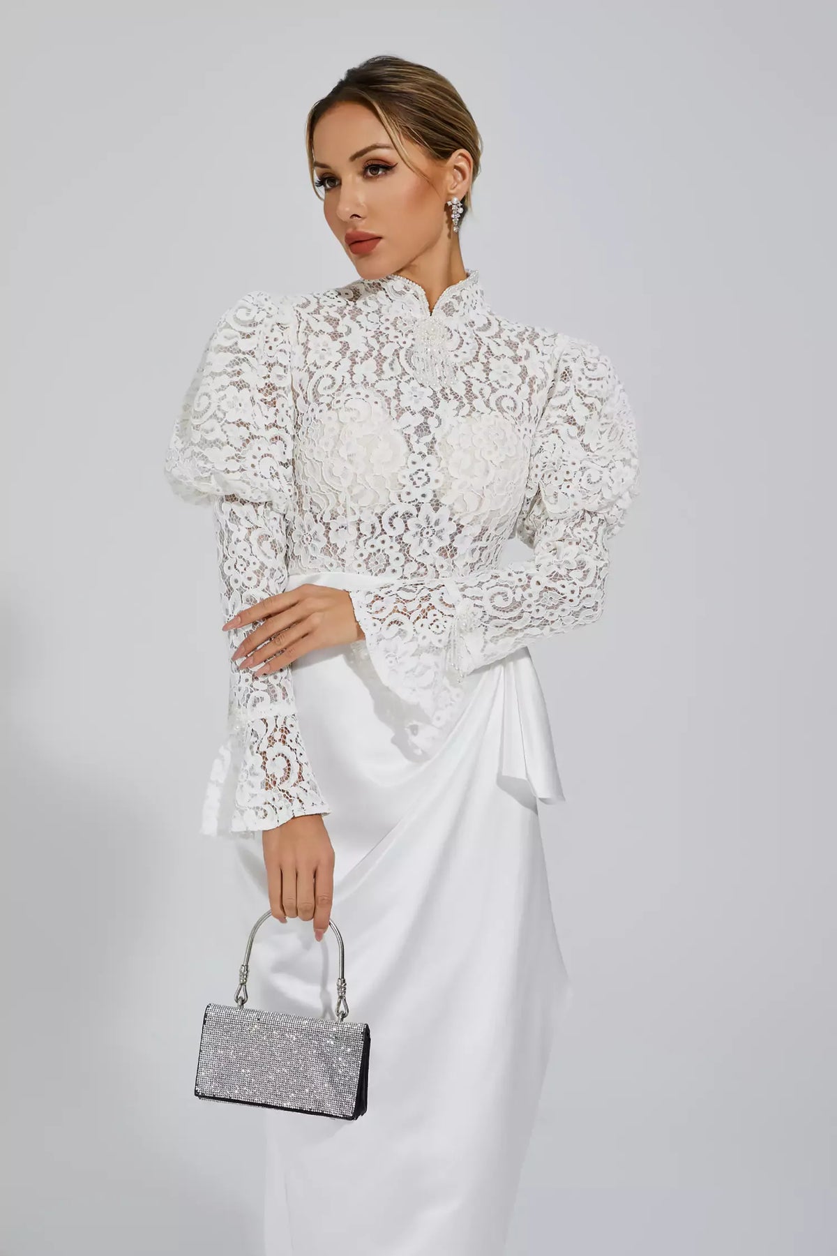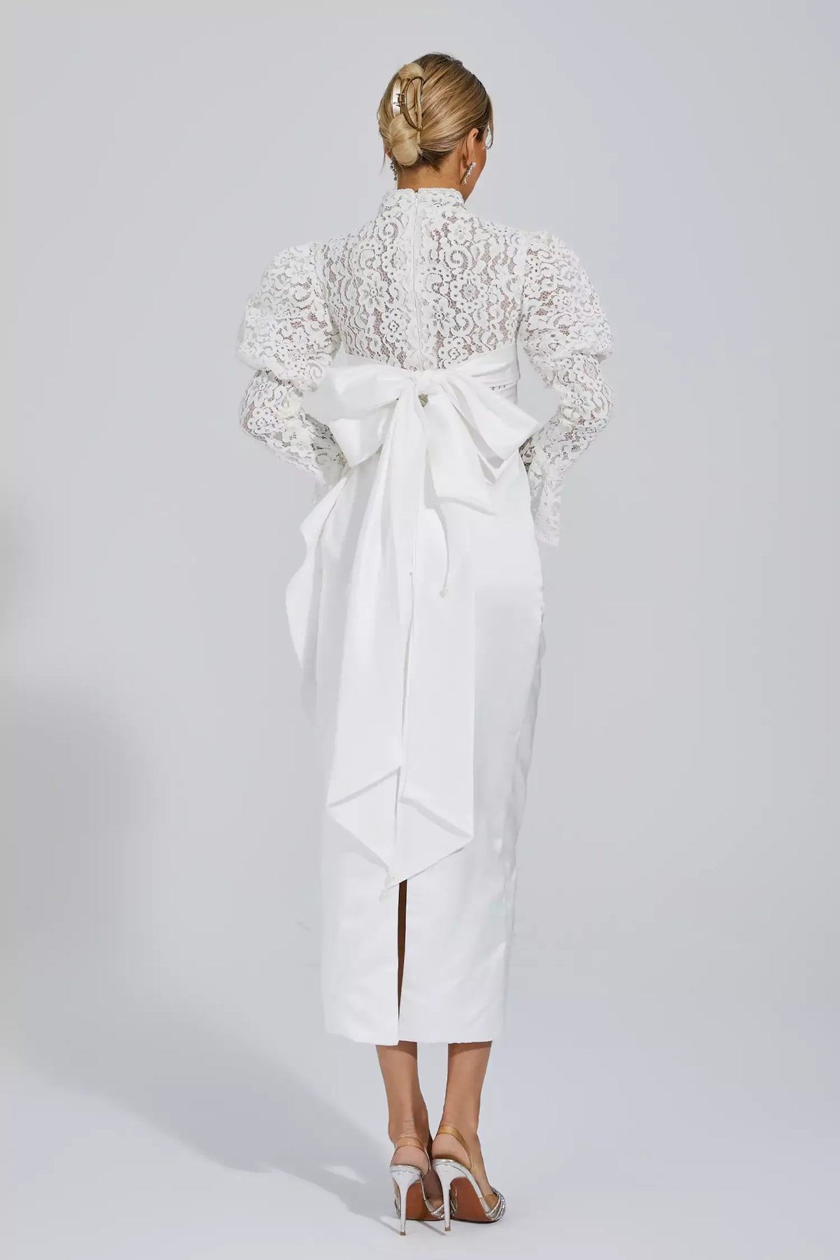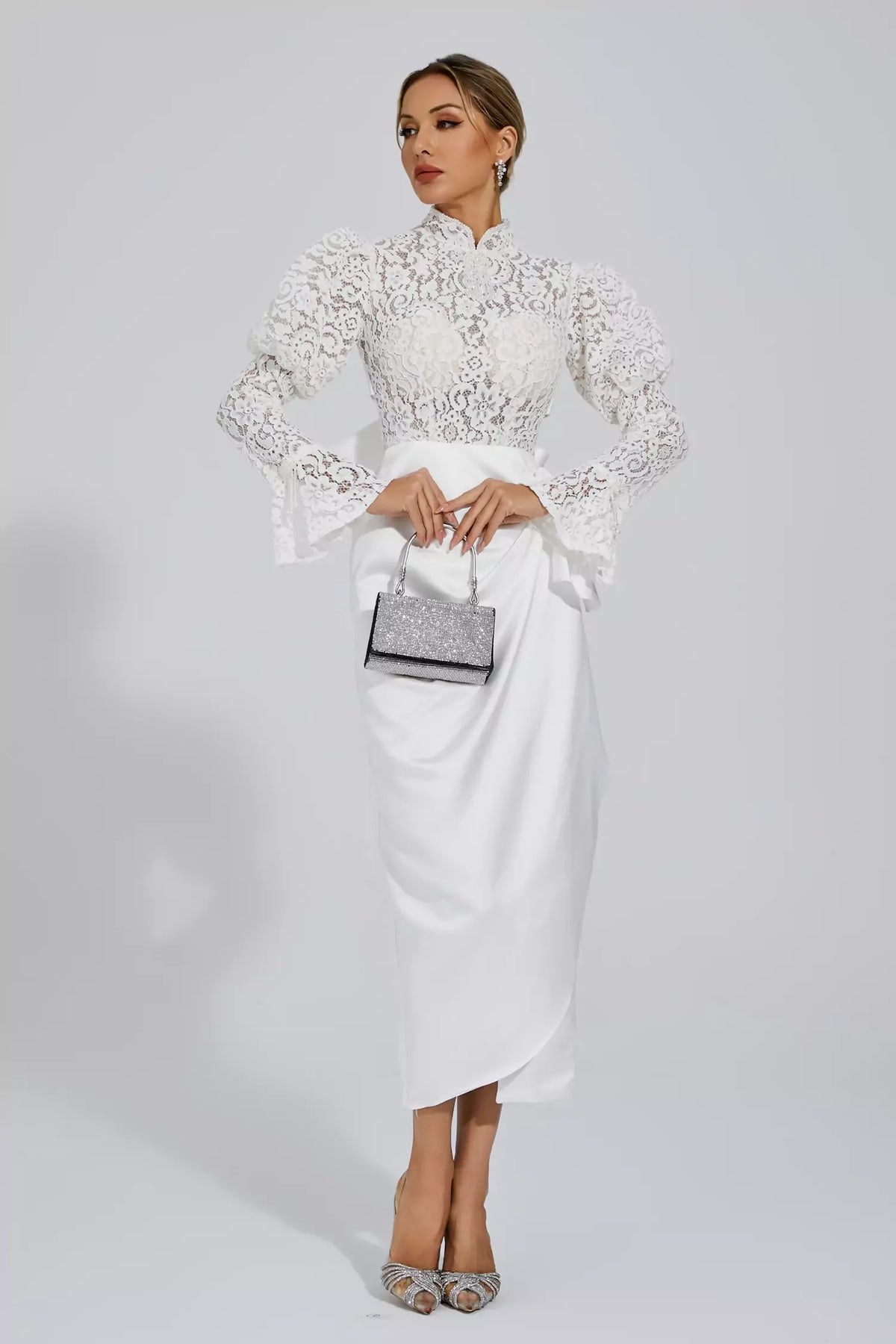 The Kailey White Lace Bubble Sleeve Midi Dress is a stunning and elegant piece that exudes timeless charm. Made with a lace upper and a satin lower, this dress combines vintage-inspired design with a modern twist. The bubble sleeves add a touch of whimsy, while the midi length adds sophistication. Ideal for engagements, special occasions, or simply stepping out.