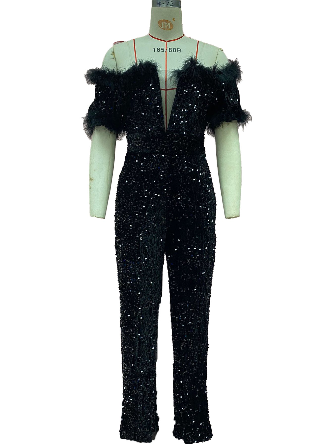 Temperament Off-Shoulder Feather Sequin Jumpsuit