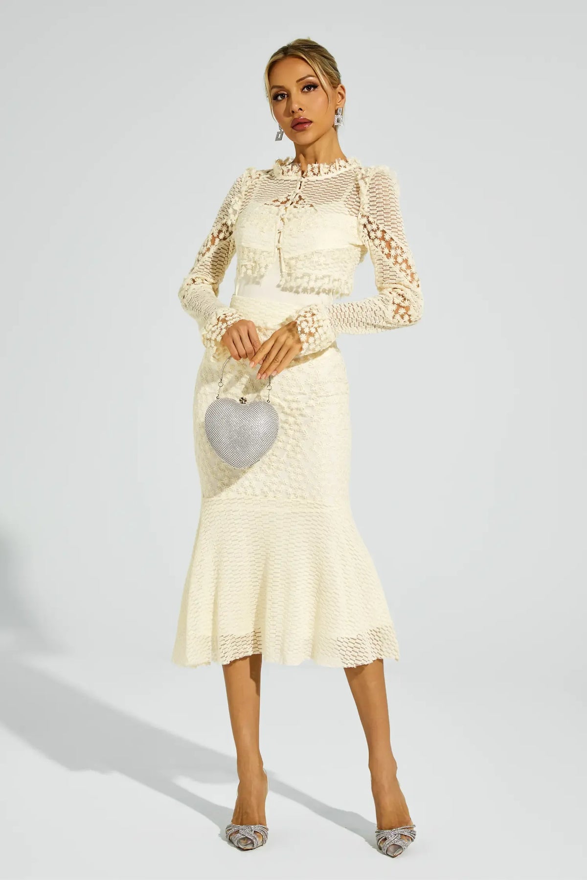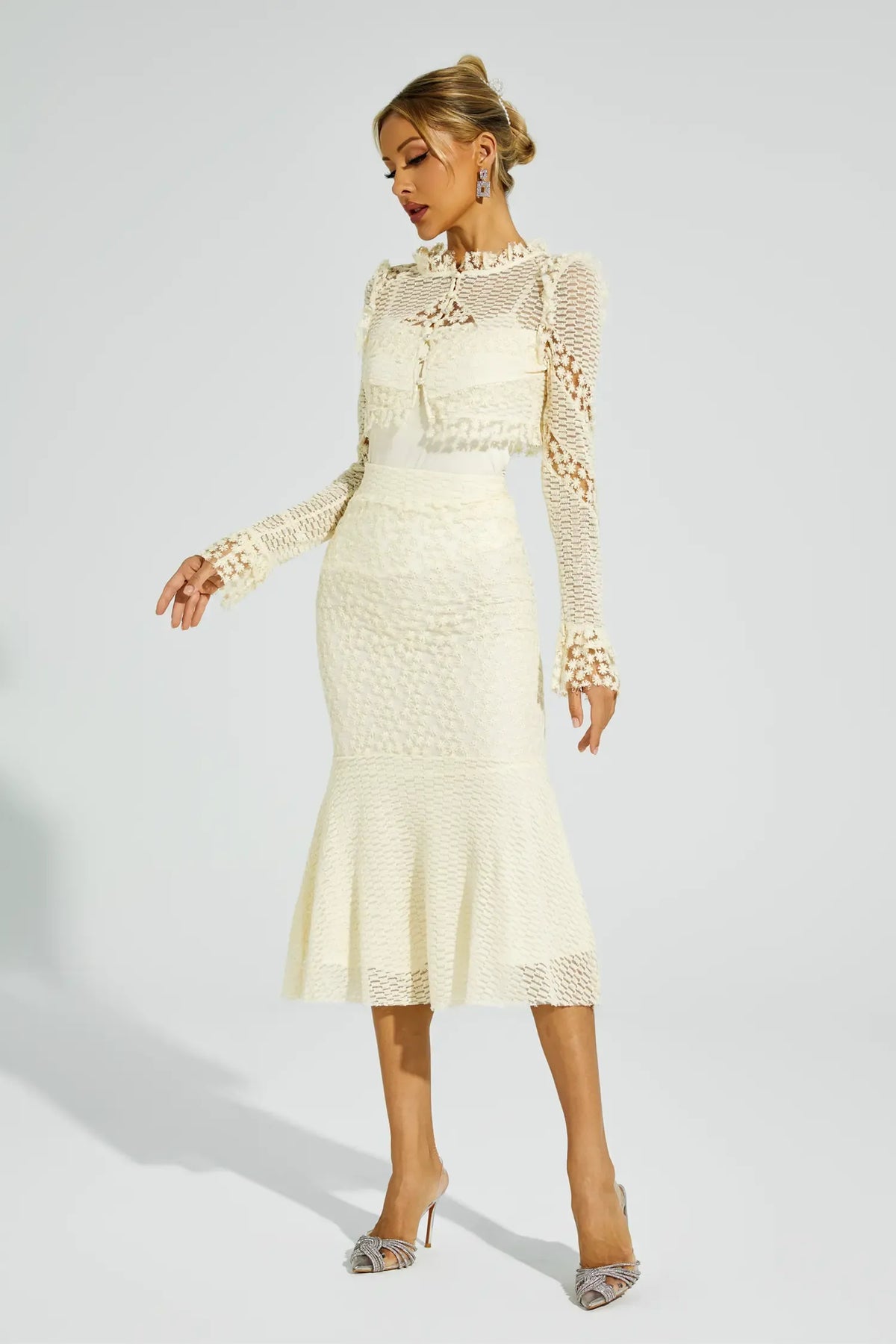 The Vita Beige Lace Trumpet Set exudes elegance and grace. This two-piece set features a sophisticated lace top and a stylish trumpet skirt. Crafted with attention to detail, this ensemble showcases a perfect blend of timeless style and contemporary fashion. Elevate your wardrobe with this versatile and effortlessly chic outfit.