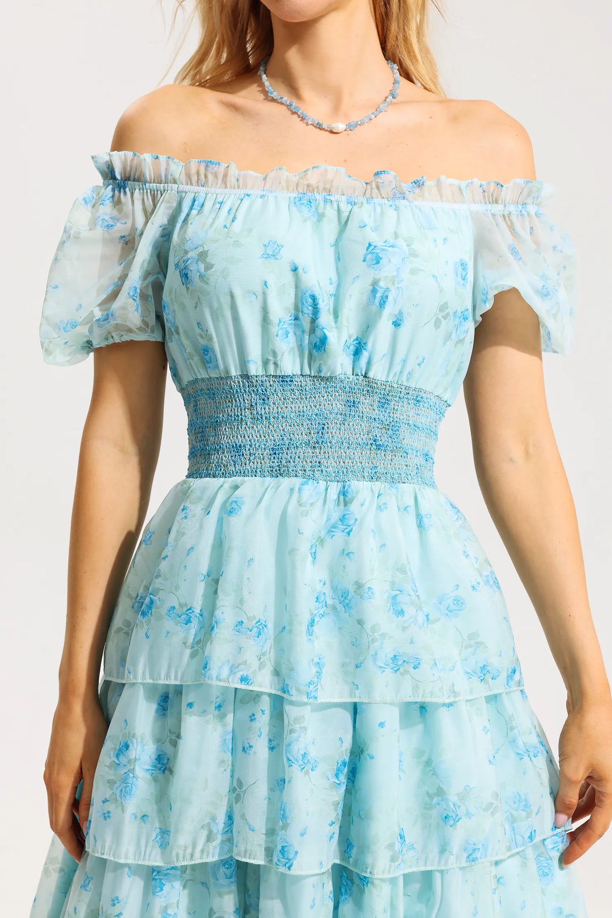 Floral Ruffle Pleated Off-Shoulder Midi Dress Blue