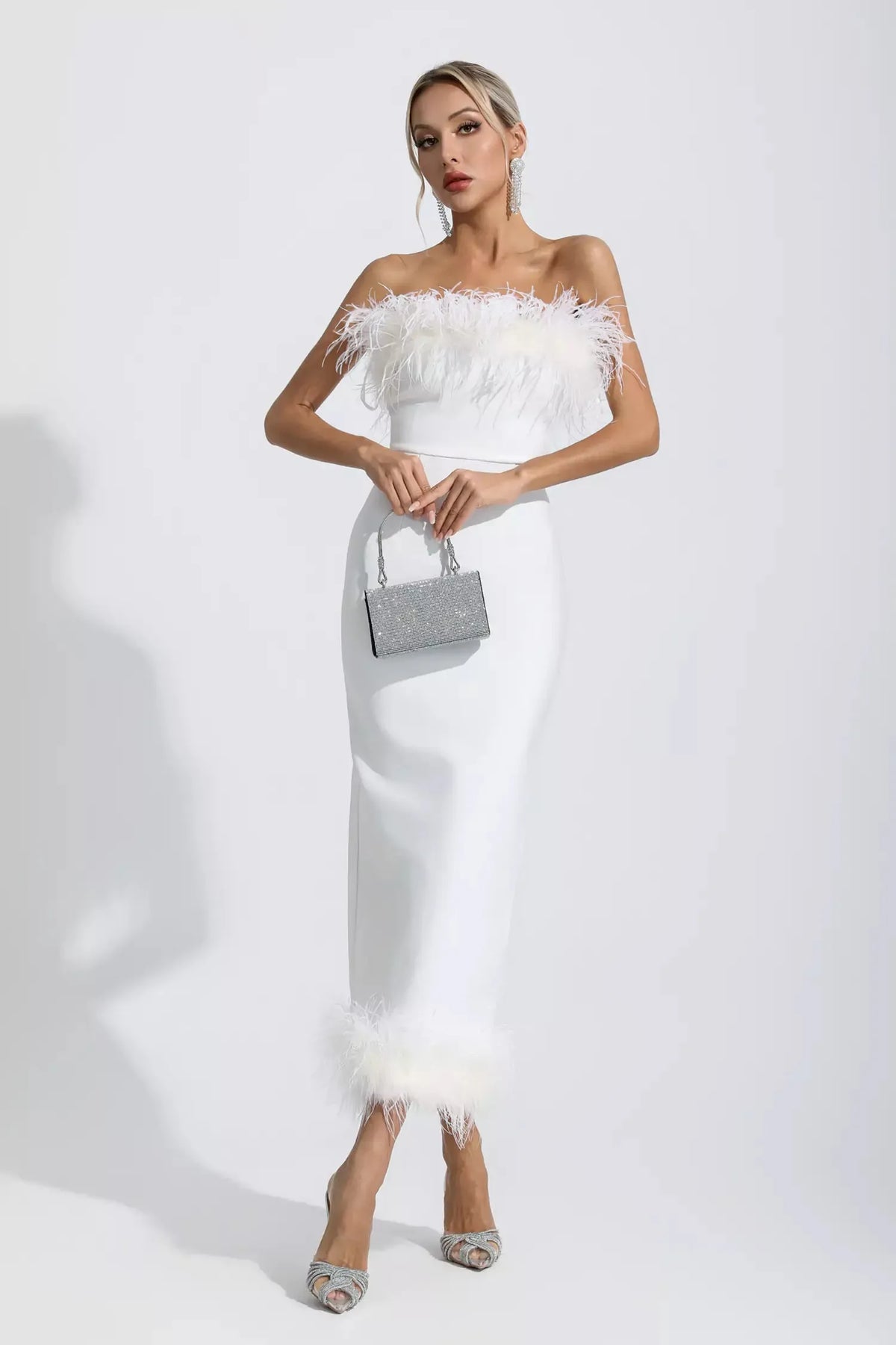 Elegant and elegant, this is the Noelle White Feather Off Shoulder Maxi Dress! The shoulders are bare, and the upper top and lower skirt are covered with feathers. Made of soft and comfortable elastic fabric, it outlines the figure curve well. All you need is a pair of heels to complete the look. This dress is perfect for any party, any occasion!