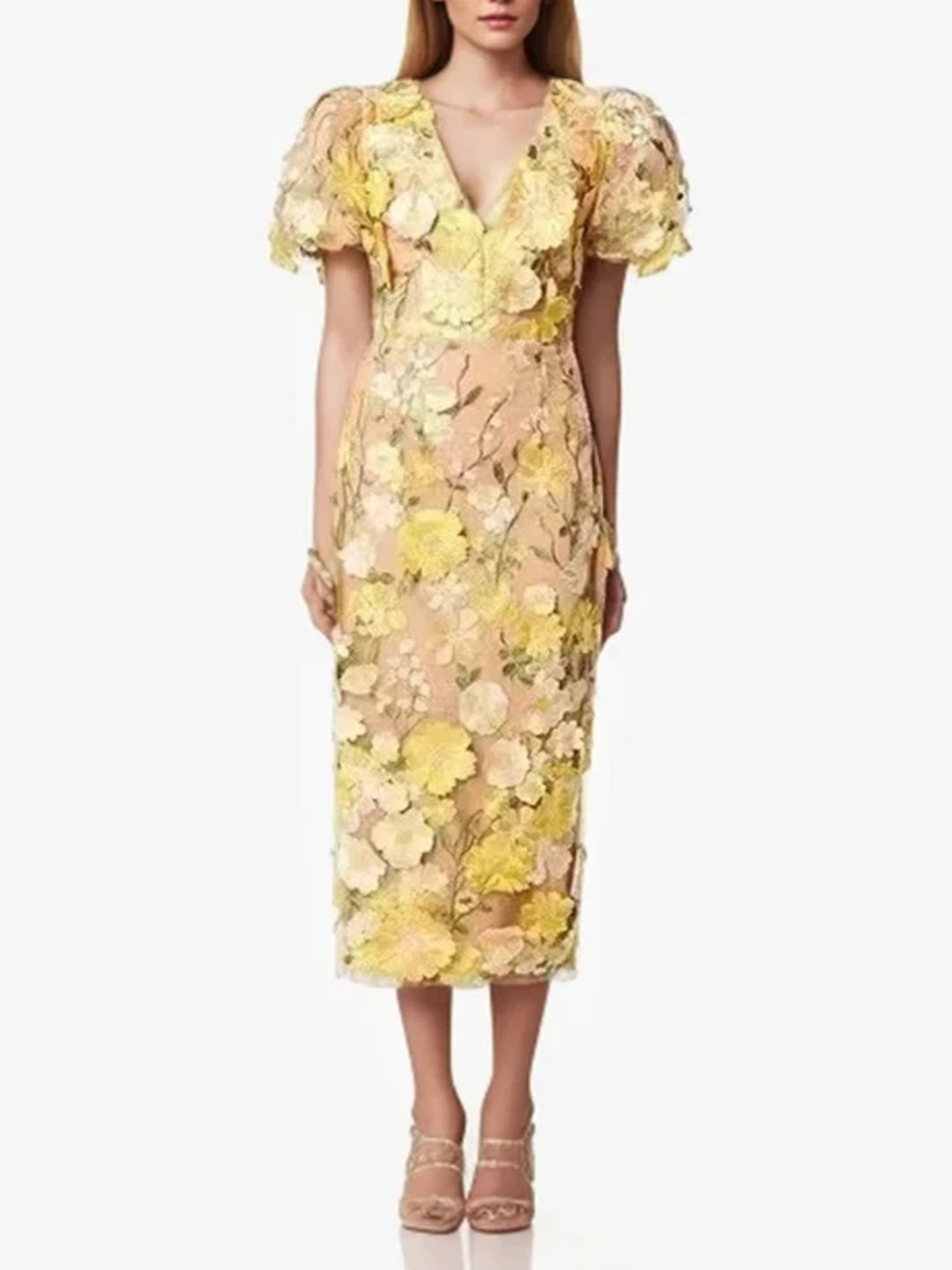 Elegant Embroidered Flower Bubble Sleeve Dress