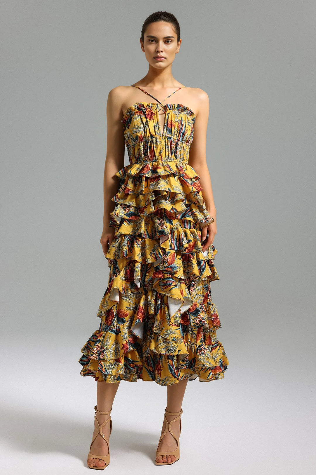 Tenley Halterneck Printed Layered Midi Dress - Yellow