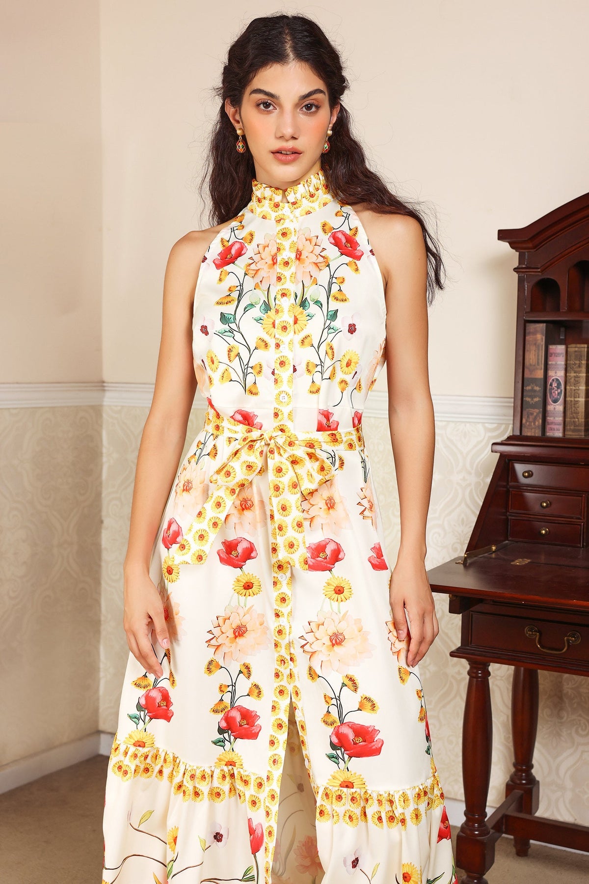 Floral High Collar Sleeveless Buttoned Lace Up Midi Dress Yellow