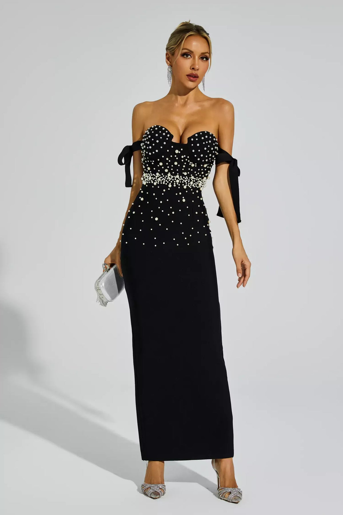 The Antony Black Pearl Embellished Bandage Dress elegantly combines sophistication and allure. Its figure-hugging silhouette enhances your curves, while the off-shoulder design adds a touch of glamour. The black color and exquisite pearl embellishments make it a standout choice for any special occasion.