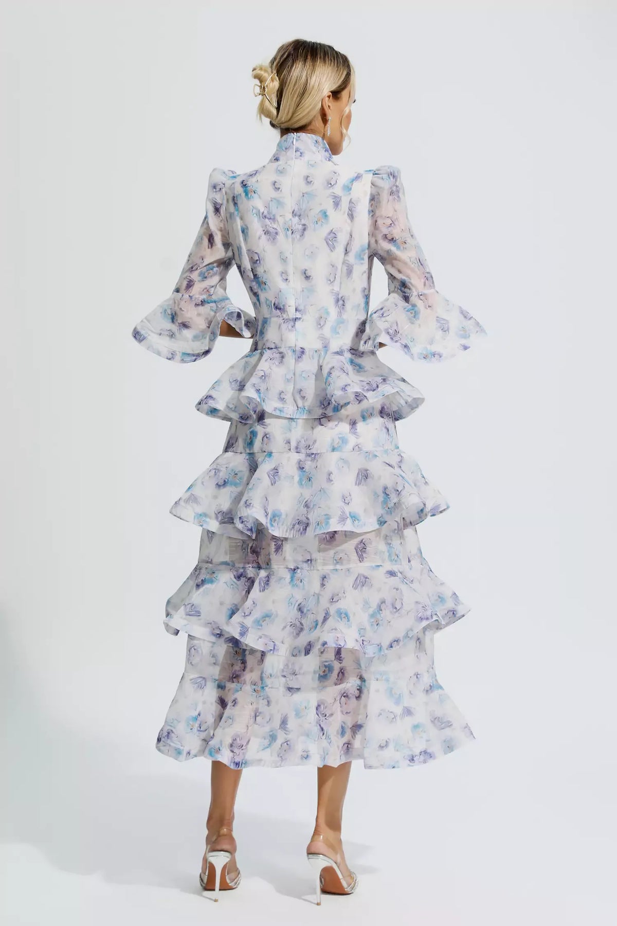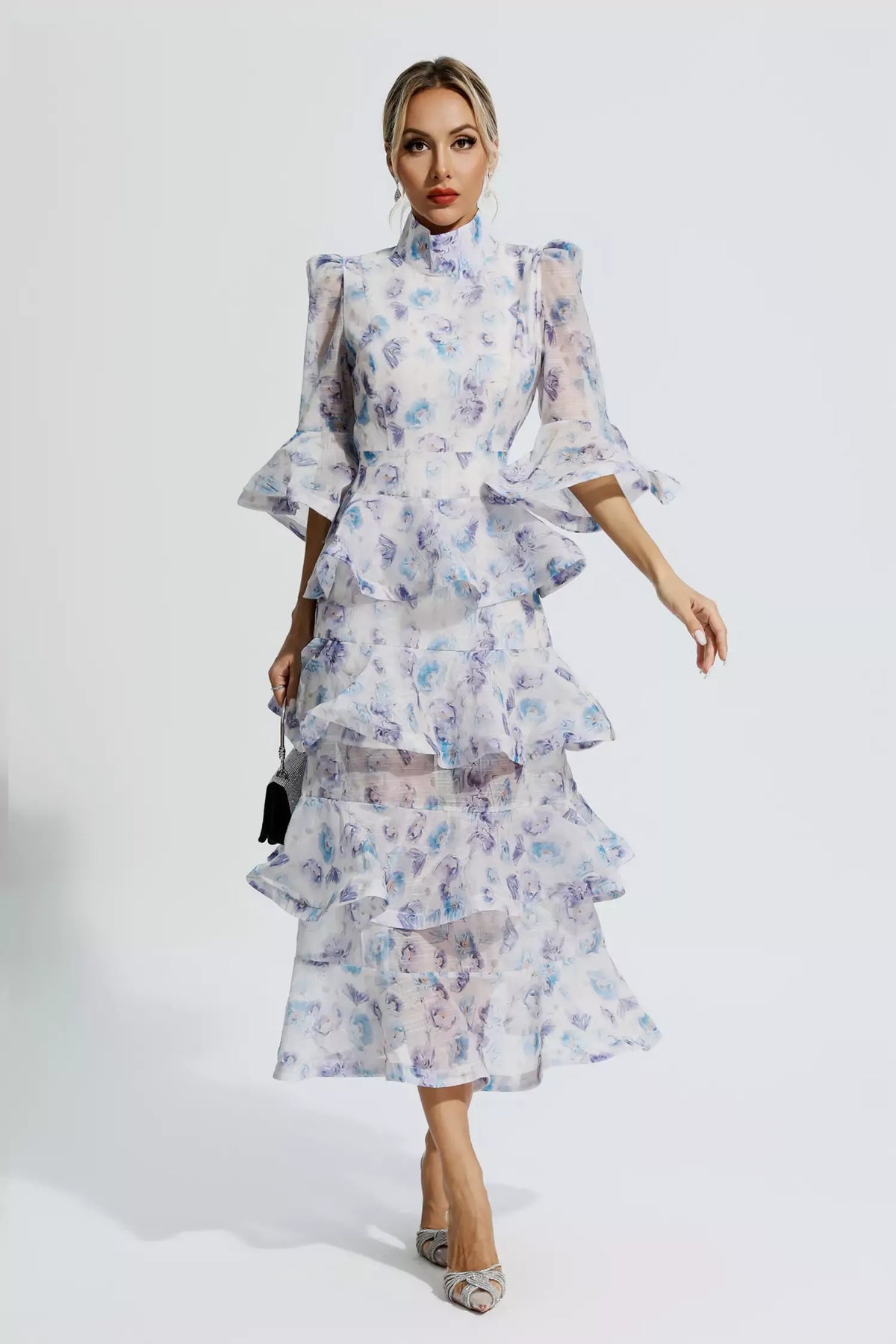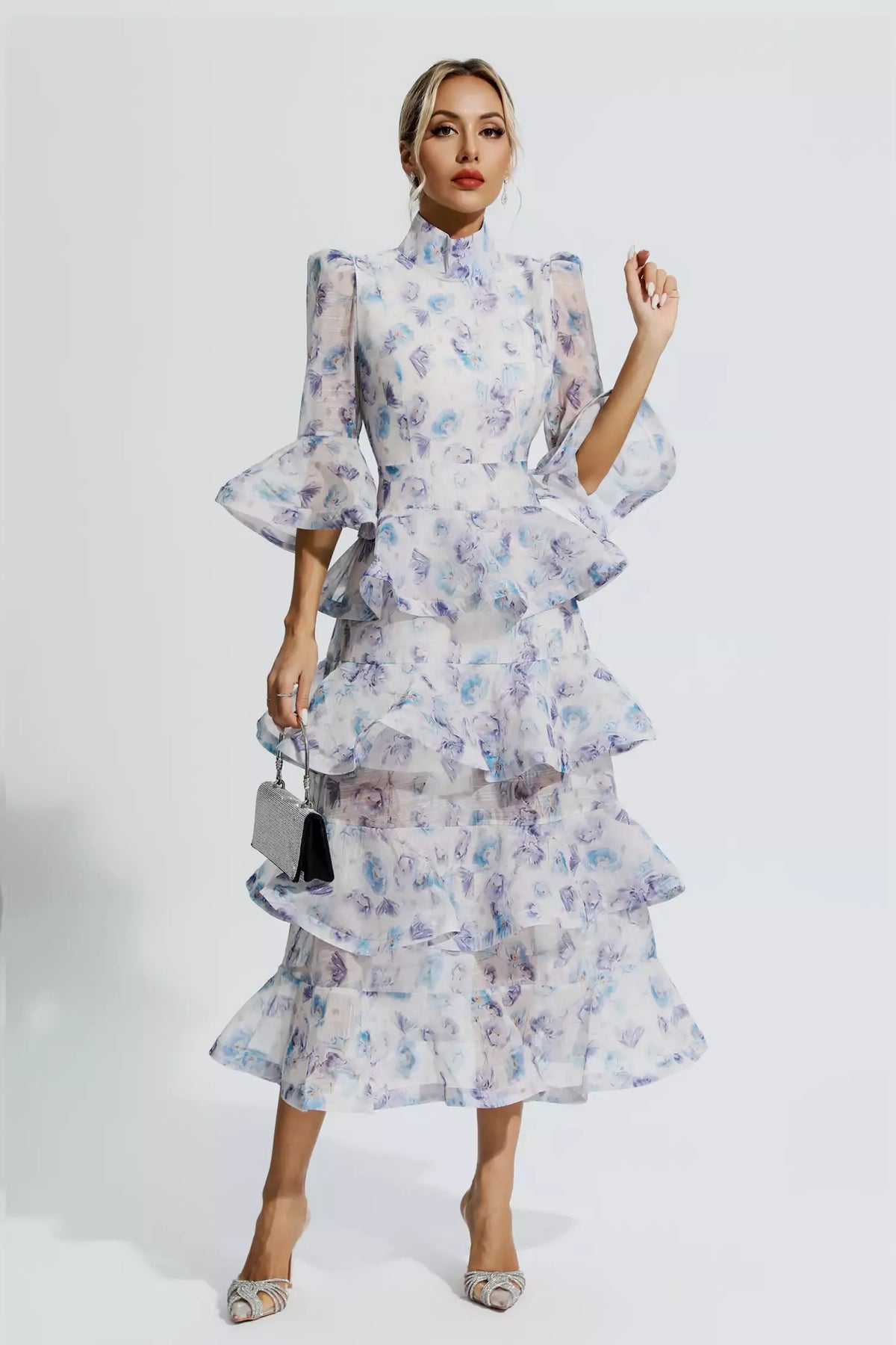The first choice for elegant women is our Carolina Blue Purple Floral Ruched Maxi Dress. Made of comfortable soft floral print fabric. The design of multiple pleated cake layers adds a unique touch. Tie at the waist to flatter your figure. A stand-up collar and bell sleeves add charm to this maxi dress. Just pair it with high heels to complete your daily wear.