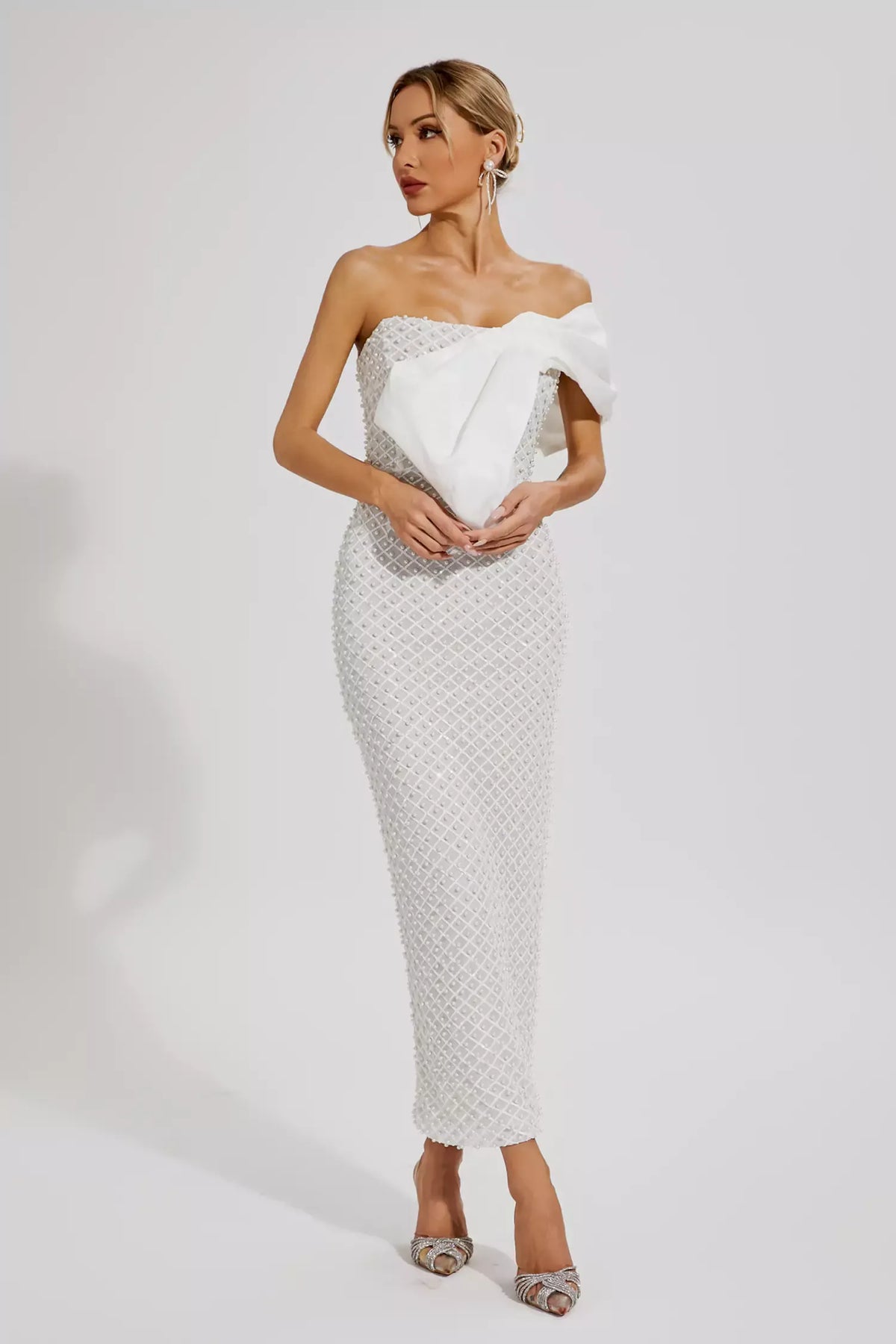 Presenting the Alisson White Pearl Embellishment Dress, an exquisite fusion of fashion and allure. This elegant strapless gown showcases a timeless charm with its tasteful pearl embellishments, exuding sophistication fit for a gracefully poised lady. Succumb to the enchantment of this long dress while emanating an aura of refined elegance.