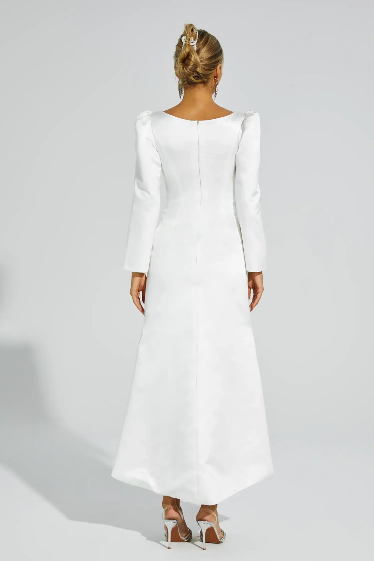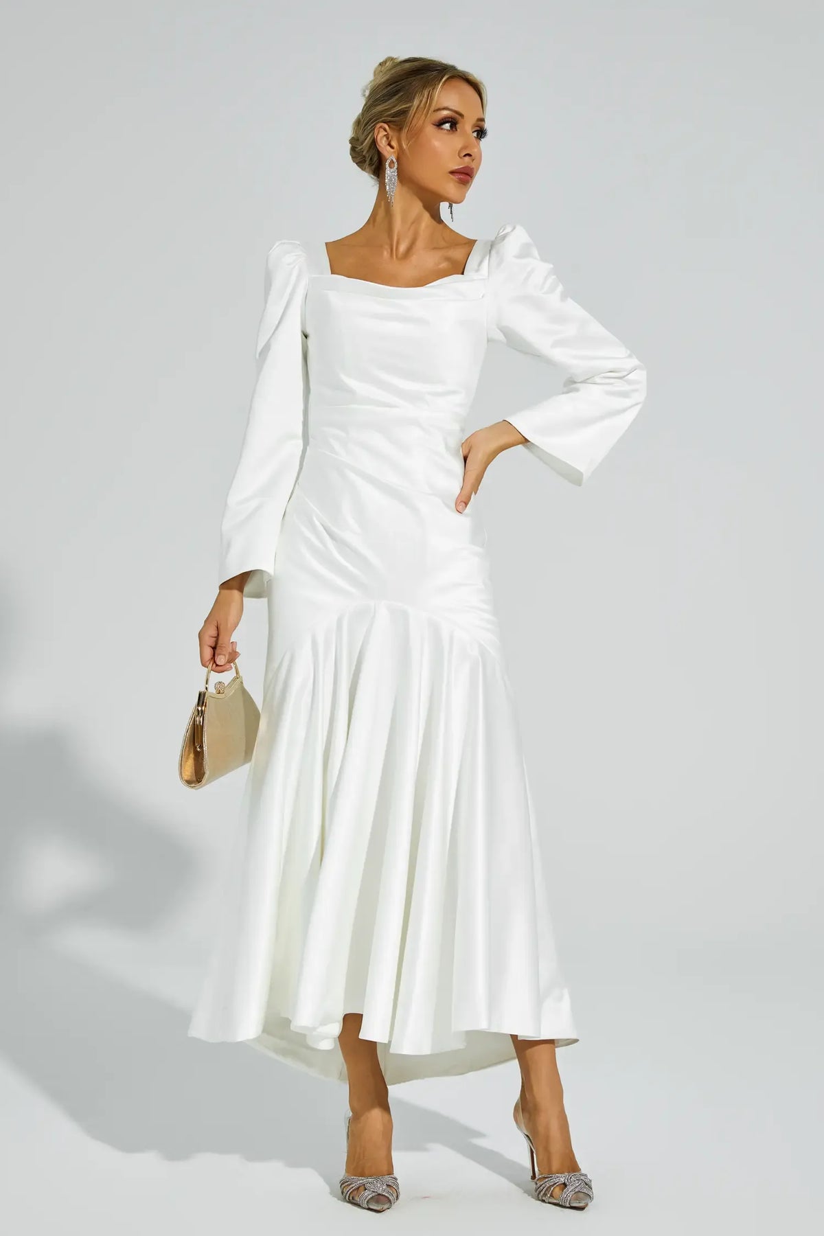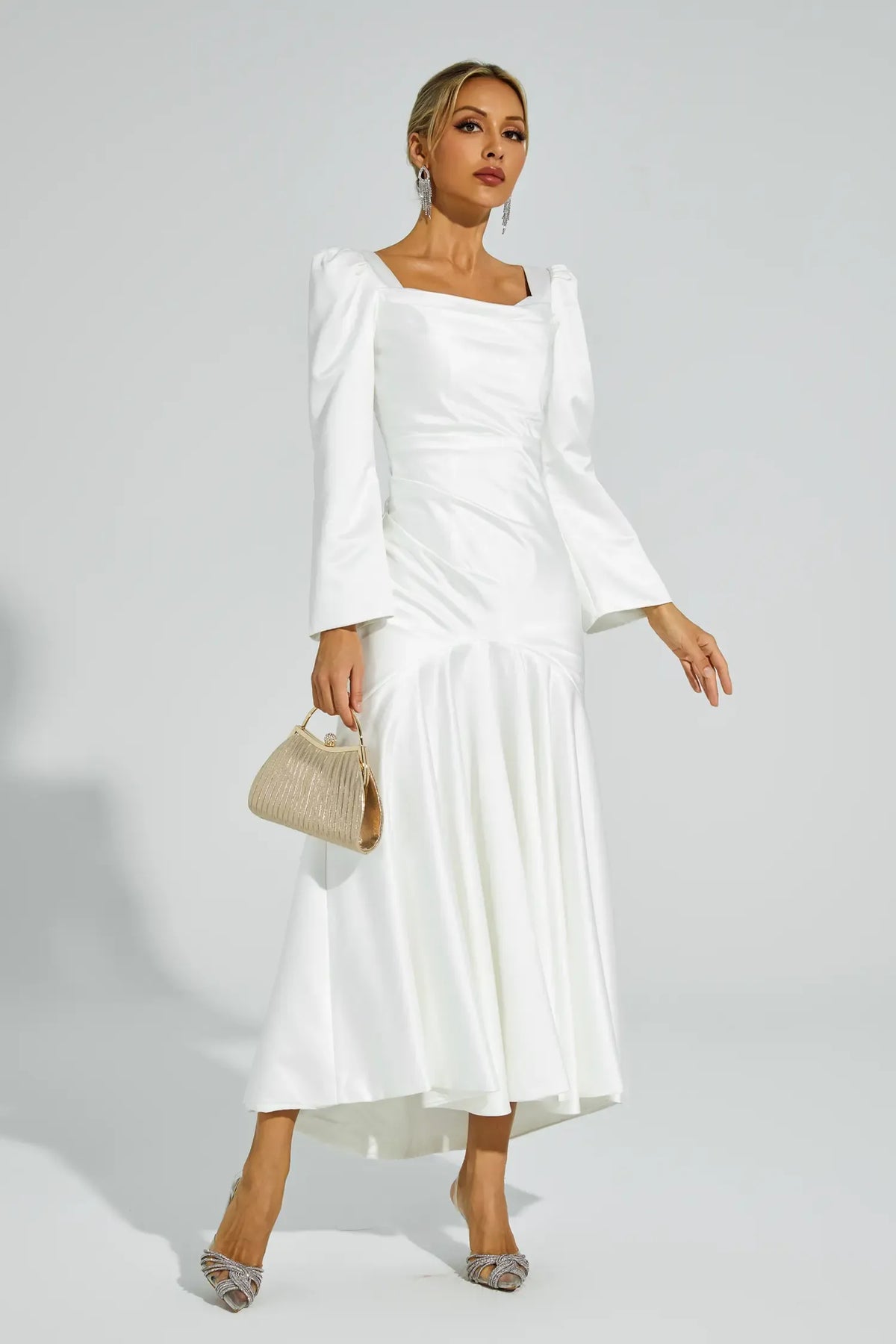 Elevate your special day with the luxurious Bruno White Satin Evening Dress. Crafted with a satin fabric, this long-sleeved gown exudes sophistication and elegance. Perfect for a bride or any formal occasion, its high-end design will ensure you look and feel glamorous. Step out in style and make a lasting impression with this exquisite dress.